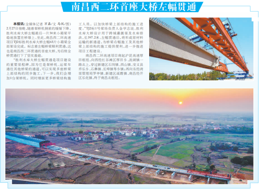 2月27日黄昏,,,,,,随着架桥机钢索的徐徐下降,,,,,,胜利水库大桥左幅最后一片30米小箱梁平稳地安排在桥墩上。。。。。。。至此,,,,,,南昌西二环高速项目TJ2标胜利水库大桥左幅65片小箱梁所有架设完成,,,,,,标记着左幅桥梁顺遂意会,,,,,,这也是南昌西二环意会的首座大桥,,,,,,为后续全桥意会打下了坚实基础。。。。。。。