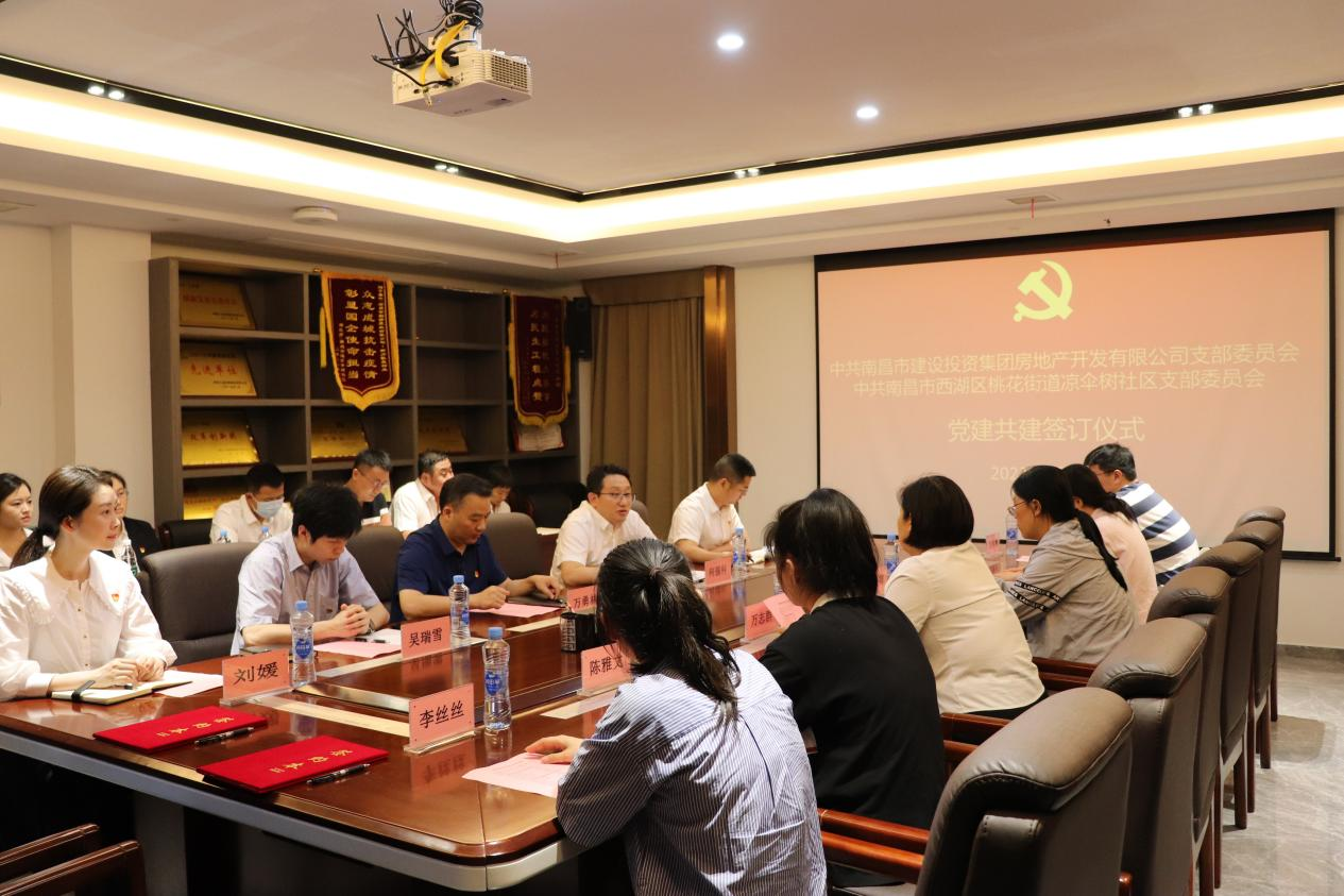 为起劲探索立异党建事情新模式,,,,,,,,探索团结党建新路径,,,,,,,,起劲形成组织共建、资源共享、生长共商的党建事情新时势,,,,,,,,6月9日,,,,,,,,南昌市建设投资集团房地产开发有限公司党支部与南昌市西湖区桃花街道凉伞树社区党支部举行了党建共建签约仪式。。。。。公司党支部委员、总司理万勇林,,,,,,,,党支部委员、副总司理何强科,,,,,,,,总司理助理吴瑞雪、手艺照料陈保福出席,,,,,,,,双方单位共16名党员加入。。。。。