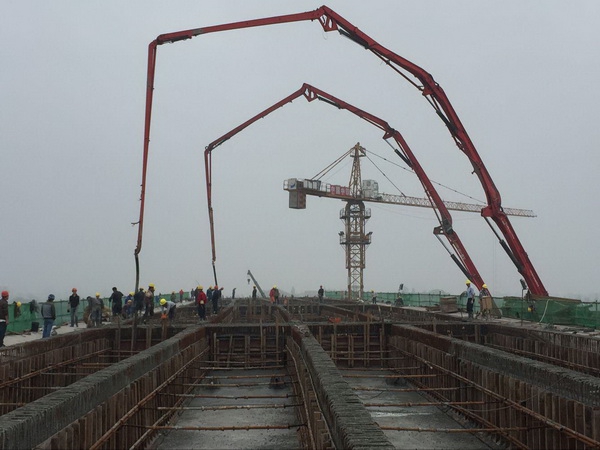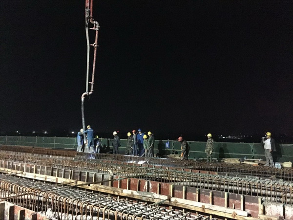 4月10日08时18分,,,,,,,陪同着机械及礼炮轰鸣声,,,,,,,昌东大道南延工程部雄溪河大桥一连梁首次浇筑混凝土准时开盘,,,,,,,本次浇筑总方量为1806方,,,,,,,浇筑桥梁跨度为190米,,,,,,,历时29个小时,,,,,,,于4月11日13时08分浇筑圆满完成!